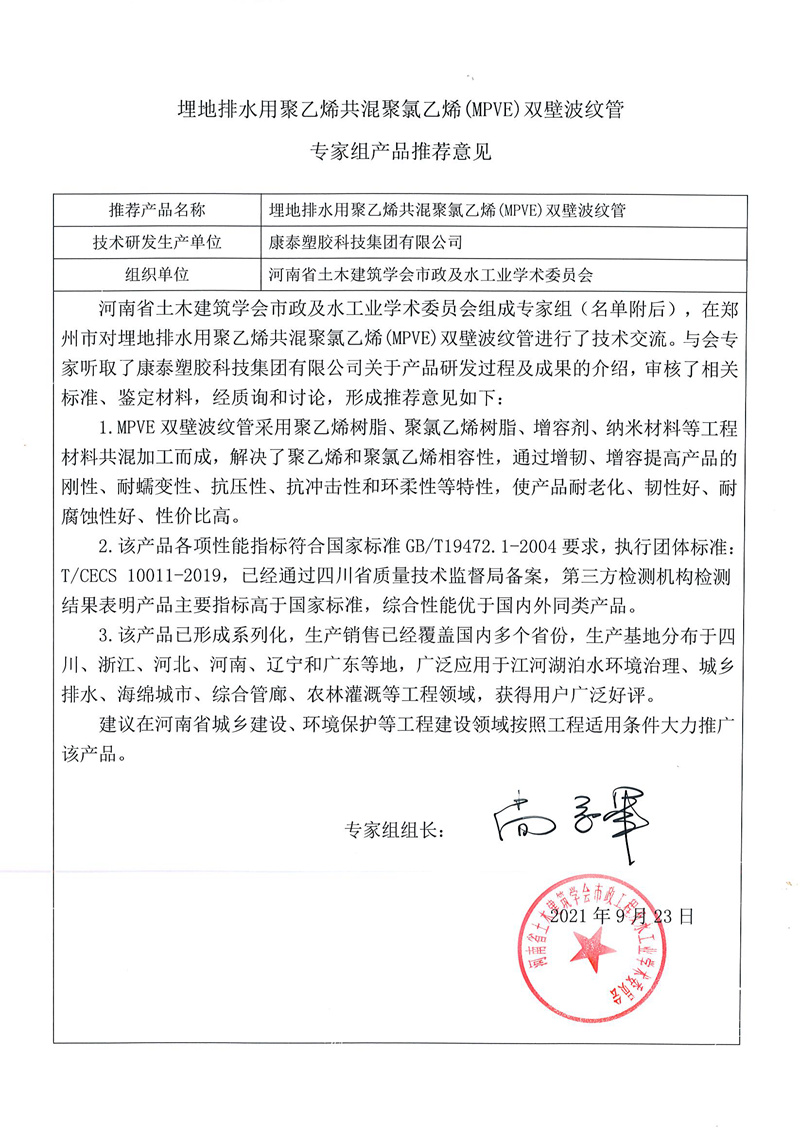 與此同時,河南省土木建筑學(xué)會市政工程及水工業(yè)學(xué)術(shù)委員會的專家組在鄭州市,對康泰集團埋地排水用聚乙烯共混聚氯乙烯(MPVE)雙壁波紋管進行技術(shù)交流后,與會專家通過審核相關(guān)標(biāo)準(zhǔn)、鑒定材料,經(jīng)質(zhì)詢和討論后形成推薦意見如下:建議在河南省城鄉(xiāng)建設(shè)、環(huán)境保護等工程建設(shè)領(lǐng)域按照工程適用條件大力推廣該產(chǎn)品。