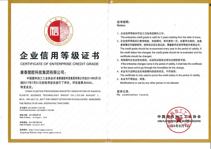 本報訊 在中國塑料加工工業(yè)協(xié)會2014-2017年度企業(yè)信用等級評級活動中,經(jīng)中國塑料加工工業(yè)協(xié)會審核批準,康泰集團在信用狀況進行了評價,獲得了AAA級榮譽證書。公司榮獲此項殊榮,是公司始終堅持“立足誠信,科學管理”的經(jīng)營理念所取得的成果。