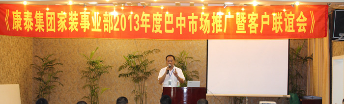 ??? 16日下午,“康泰集團(tuán)家裝事業(yè)部2013年度巴中市場推廣暨客戶聯(lián)誼會(huì)”在琴鶴苑召開。會(huì)議上,營銷中心總監(jiān)何朝暉向經(jīng)銷商們介紹了公司品牌營銷的戰(zhàn)略規(guī)劃。公司重視規(guī)模,通過品牌策劃拓展終端市場的各種政策與支持堅(jiān)定了商家們與康泰共同發(fā)展的信心和決心。
