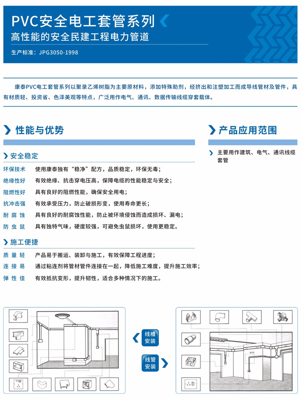 康泰牌PVC電工管是以聚氯乙烯樹脂為主要原材料,添加特殊助劑,經(jīng)擠出和注塑加工而成的導(dǎo)線管材或管件,具有材質(zhì)輕、投資省、色澤美觀等特點,廣泛用作電氣、通訊、數(shù)據(jù)傳輸線纜穿套載體。
