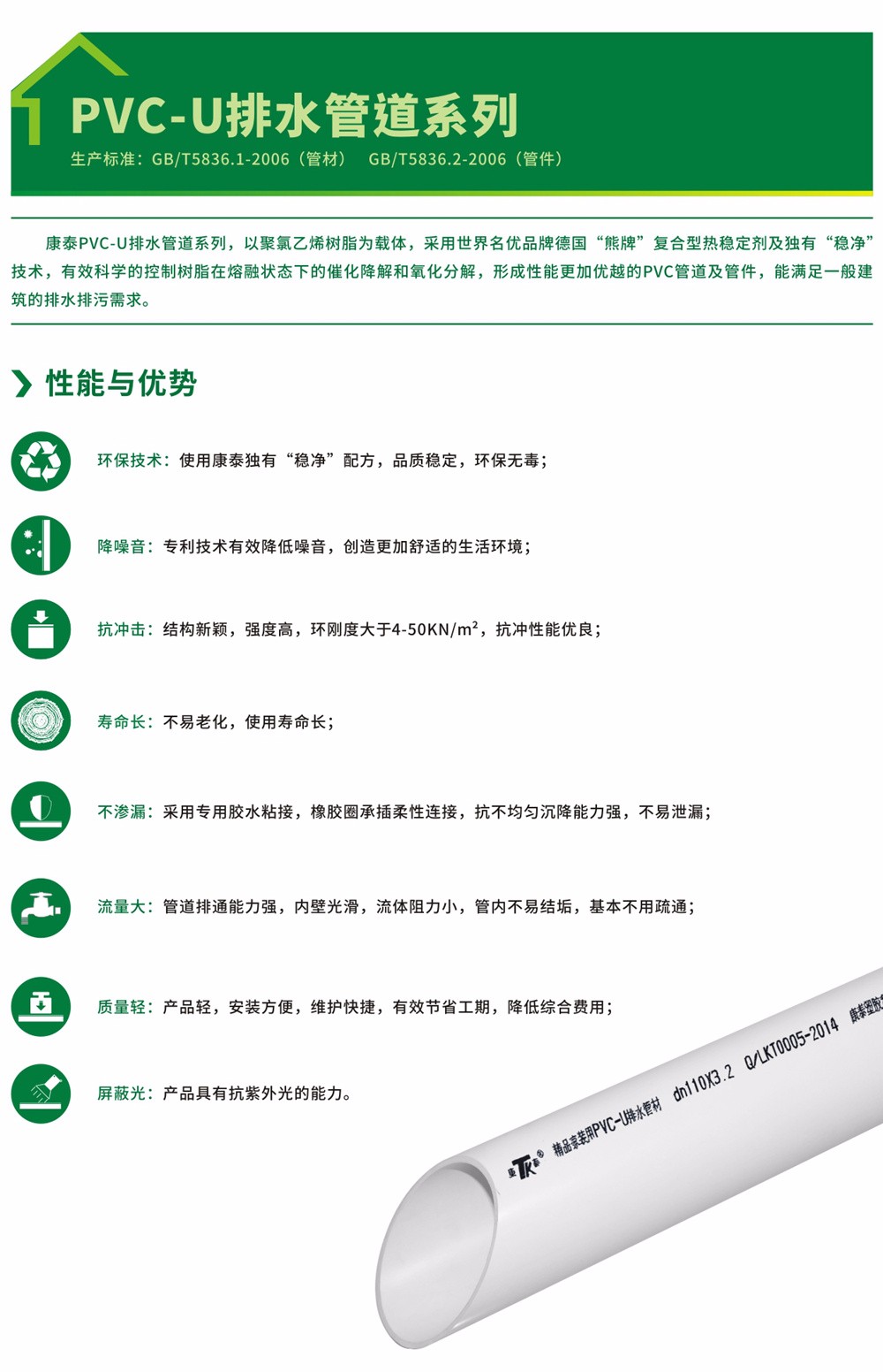 生產(chǎn)標準:GB/T5836.1-2006(管材) GB/T5836.2-2006(管件)