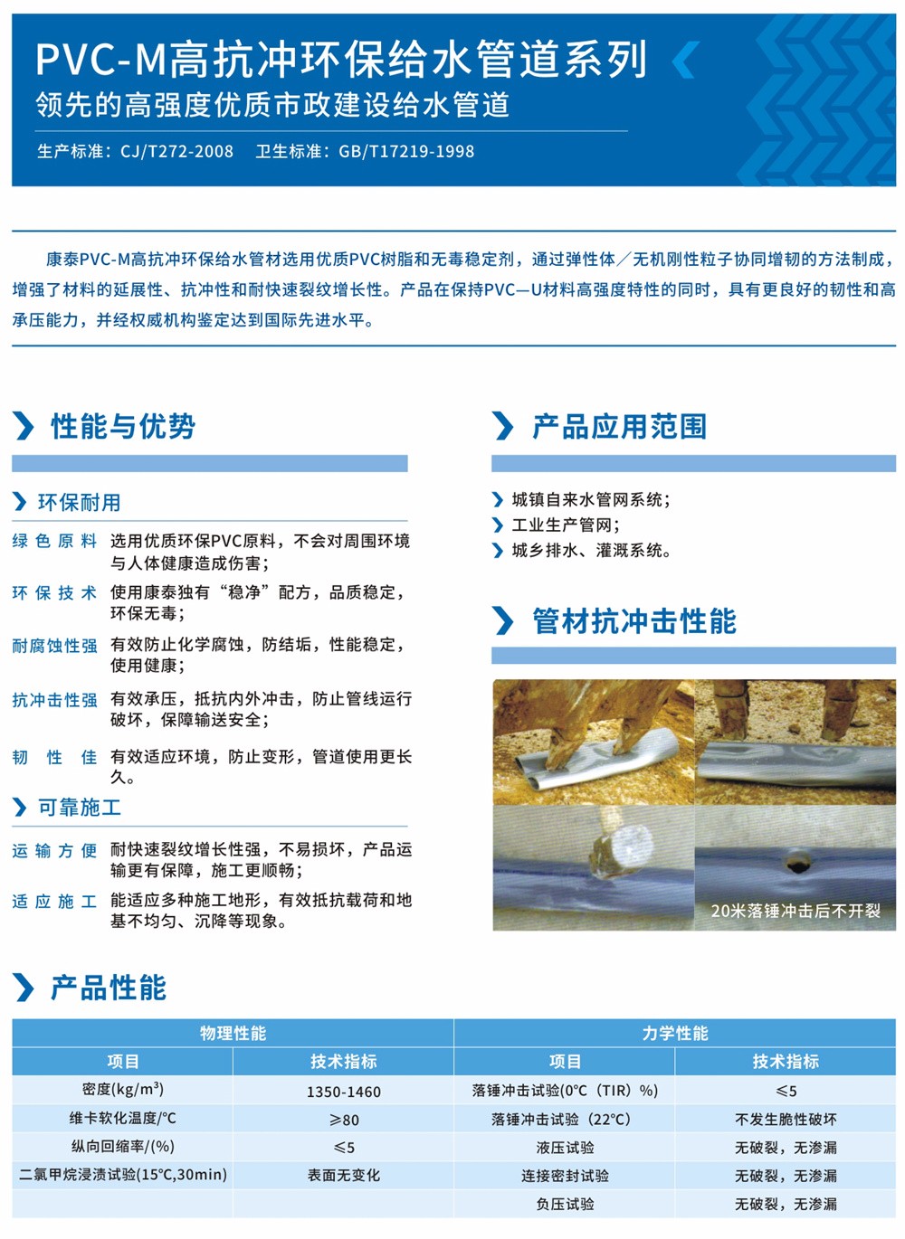 康泰塑膠科技集團(tuán)有限公司生產(chǎn)的PVC-M高抗沖環(huán)保給水管材是在優(yōu)選PVC樹脂、無毒穩(wěn)定劑的基礎(chǔ)上,通過彈性體/無機(jī)剛性粒子協(xié)同增韌的方法制成的,采用該工藝生產(chǎn)的PVC-M高抗沖環(huán)保給水管材在保持PVC-U材料高強(qiáng)度特性的同時,具有更良好的韌性和高承壓能力,增強(qiáng)了材料的延展性、抗沖性、耐快速裂紋增長性。產(chǎn)品經(jīng)國家塑料制品質(zhì)量監(jiān)督檢測中心、四川省、河南省衛(wèi)生檢測中心等權(quán)威機(jī)構(gòu)檢測,其衛(wèi)生性能、物理性能和力學(xué)性能完全符合相關(guān)國家標(biāo)準(zhǔn)和企業(yè)標(biāo)準(zhǔn),經(jīng)專家委員會鑒定達(dá)到國際先進(jìn)水平。