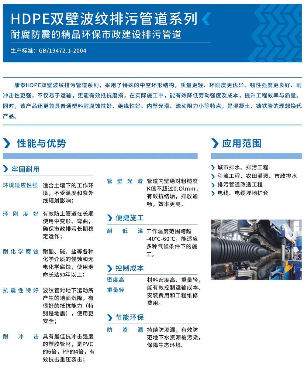 HDPE雙壁波紋管有普通塑料管所具有的耐腐蝕性好、絕緣性好、內(nèi)壁光滑、流動(dòng)阻力小等特點(diǎn)以外,還因采用了特殊的中空環(huán)形結(jié)構(gòu),具有優(yōu)異的環(huán)剛度和良好的強(qiáng)度與韌性,及重量輕、耐沖擊性強(qiáng)、不易破損等特點(diǎn),目前在發(fā)達(dá)國(guó)家的諸多領(lǐng)域已經(jīng)廣泛應(yīng)用,尤其是在美國(guó)、加拿大、日本以及歐洲許多國(guó)家,雙壁波紋管廣泛應(yīng)用于市政排水排污、農(nóng)業(yè)灌溉、煤礦通風(fēng)、化工,此外,對(duì)比混凝土、鑄鐵管,有運(yùn)輸安裝方便,降低施工人員勞動(dòng)強(qiáng)度及降低工程的總投資等優(yōu)勢(shì),是混凝土、鑄鐵管的理想換代產(chǎn)品。